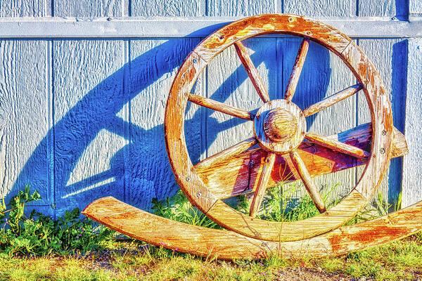 Old wooden wagon wheel against a sunlit blue wall in the Arizona countryside — weathered, warm, and full of rustic character.