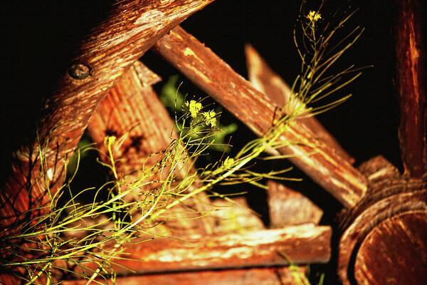 Golden light touches weathered wood and delicate blooms. New life weaves gently through what time has left behind.